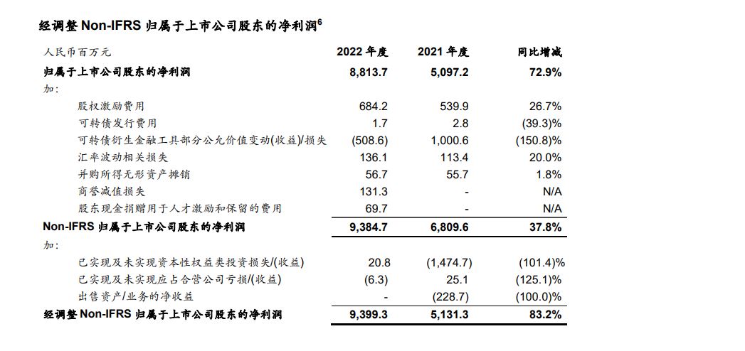 经调整Non-IFRS归母净利润93.99亿元,同比增长83.2%