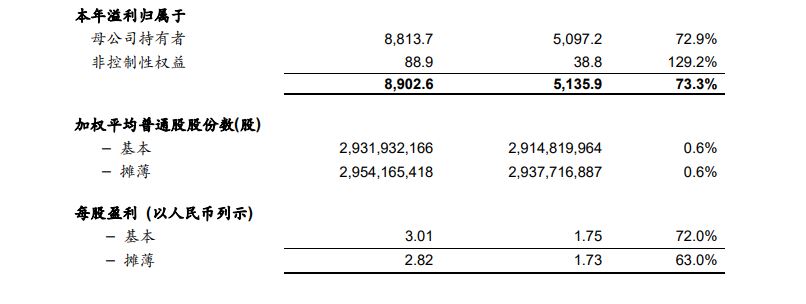 ●稀释每股收益2.82元,同比上升63.0%;稀释经调整Non-IFRS每股收益3.18元,同比增长81.7%。