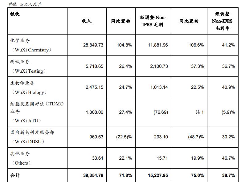 ●化学业务 (WuXi Chemistry) 实现收入288.50亿元,同比增长104.8%,经调整Non-IFRS毛利118.82亿元,同比增长106.6%,毛利率为41.2%。