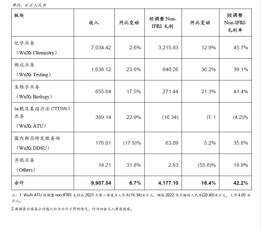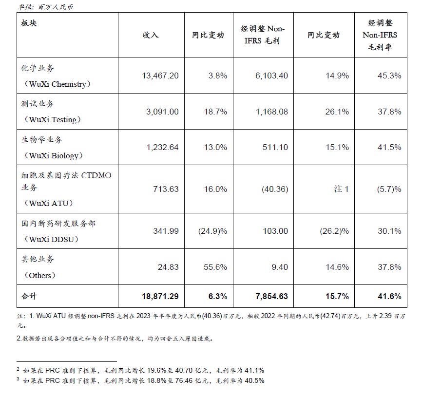 • 生物学业务 (WuXi Biology) 实现收入6.56亿元,同比增长17.5%,经调整non-IFRS毛利2.71亿元,同比增长21.3%,毛利率为41.4%。