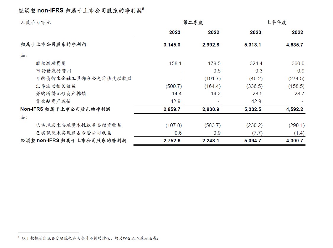 • 上半年经调整Non-IFRS归母净利润50.95亿元,同比增长18.5%